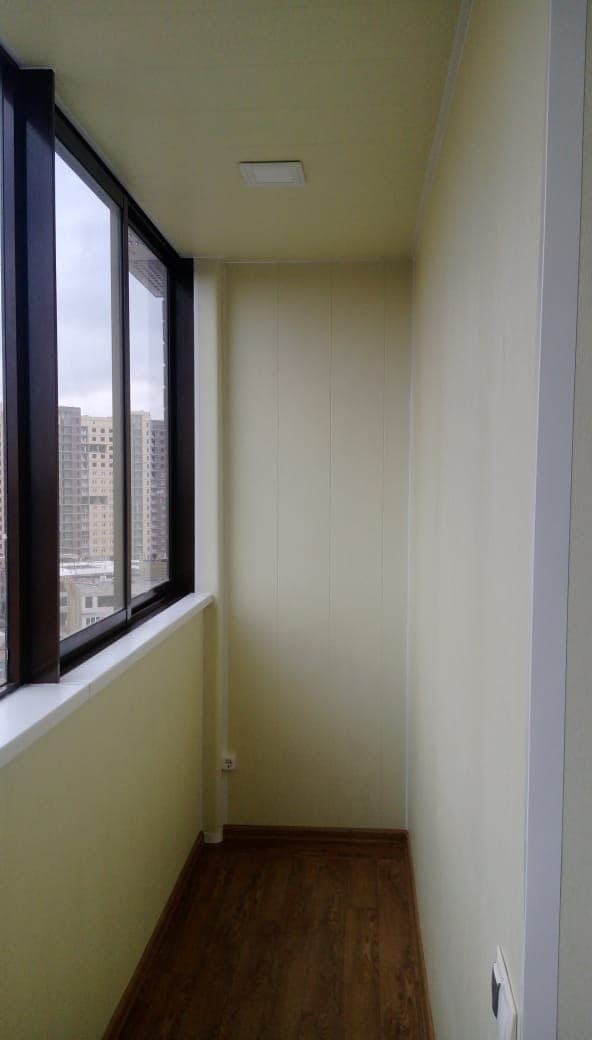 Выполненные работы: Остекление лоджии профилем REHAU Intelio 80, Утепление и отделка ламинированными панелями, Проводка электрики и установка шкафа